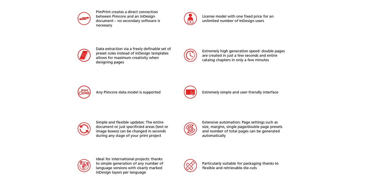 PimPrint is an InDesign plugin that creates a direct link between Pimcore and an InDesign document. This makes PimPrint currently one of the most efficient solutions on the market for creating individualized print products directly and automatically from the product database (PIM). In addition, our latest release makes the solution even more powerful and user-friendly. Discover all the advantages of PimPrint right here!